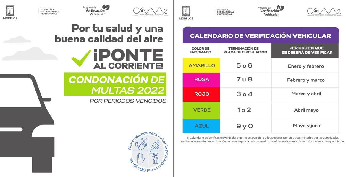 A fin de mantener una buena calidad del aire en Morelos y salvaguardar la salud de las y los ciudadanos, la Secretaría de Desarrollo Sustentable (SDS) informa que, con fecha del 25 de febrero del año en curso, ha sido publicado en el Periódico Oficial “Tierra y Libertad”, número 6048, el acuerdo por el que se condona en un 100 por ciento el pago del monto de las multas a que hayan hecho acreedores por verificación vehicular extemporánea, el cual, será válido para el primer semestre de verificación 2022.