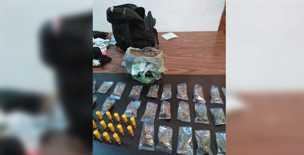 Entre estos, un arma de fuego calibre .22 milímetros, una escopeta calibre 16, 26 cartuchos de distintos calibres, un tabique de un kilo con mariguana y 29 pequeñas bolsas con la misma hierba, 15 bolsas con sustancia brillante similar a la droga “cristal”, tres pipas y dos básculas.