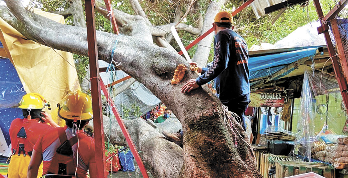 Cuernavaca.- Una mujer lesionada y cuantiosos daños materiales fue el saldo que dejó la caída de un árbol de muchos años de antigüedad sobre los puestos del tianguis navideño del mercado Adolfo López Mateos de Cuernavaca.