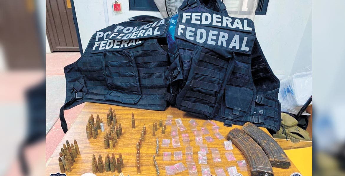 Decomiso. Treinta dosis de ‘cristal’, dos chalecos con la leyenda de Policía Federal y dos cargadores, les hallaron a la pareja detenida.