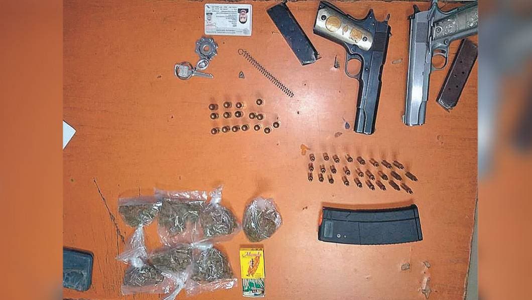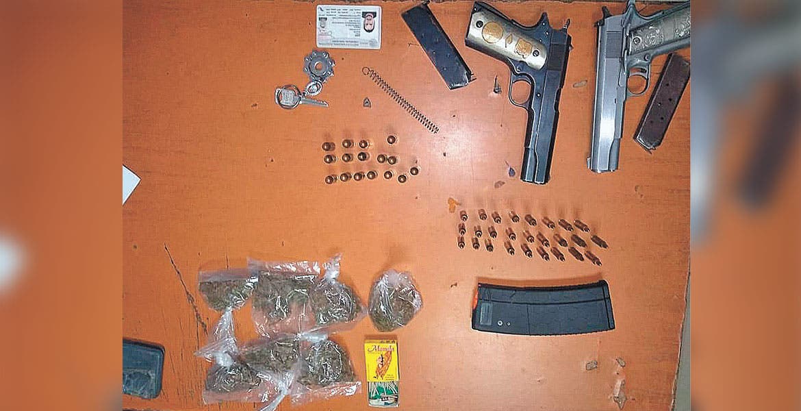 Al ser revisados, a los sujetos les hallaron un cargador abastecido con 26 balas calibre .223 milímetros, de AR15, seis bolsas con mariguana, dos pistolas .45 milímetros, con dos cargadores con 16 balas, por lo que fueron detenidos.
