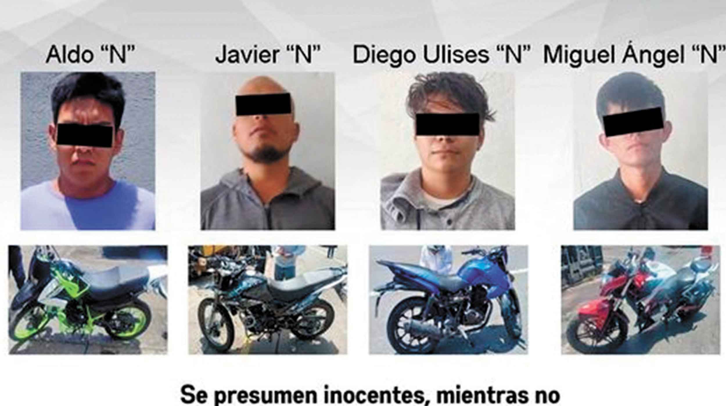 Los detenidos son Aldo “N”, de 18 años; Javier “N”, de 30; Diego Ulises “N”, de 21; y Miguel Ángel “N”, de 21 años, quienes fueron puestos a disposición del Ministerio Público.