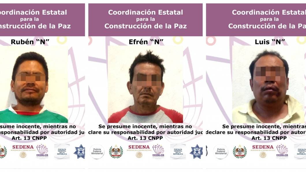 Los efectivos policiales establecieron un perímetro de seguridad y realizaron el aseguramiento de los tres hombres identificados como Luis N” de 42 años, Efrén “N” de 48 años y Rubén “N” de 45 años de edad, todos ellos avecindados en el Municipio de Jantetelco, a quienes se les aseguró la camioneta con reporte de robo, un arma de fuego calibre 380 abastecida con 6 cartuchos útiles y uno percutido, una caja con 39 cartuchos útiles del mismo calibre.