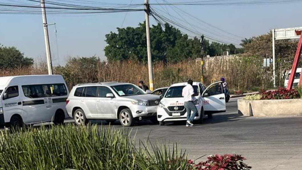 Jojutla.– La mañana de este miércoles se registró un accidente vehicular en la glorieta de la colonia Los Pilares, donde una camioneta particular impactó de costado a un taxi, hecho que generó un fuerte susto entre los involucrados, aunque no se reportaron personas lesionadas.