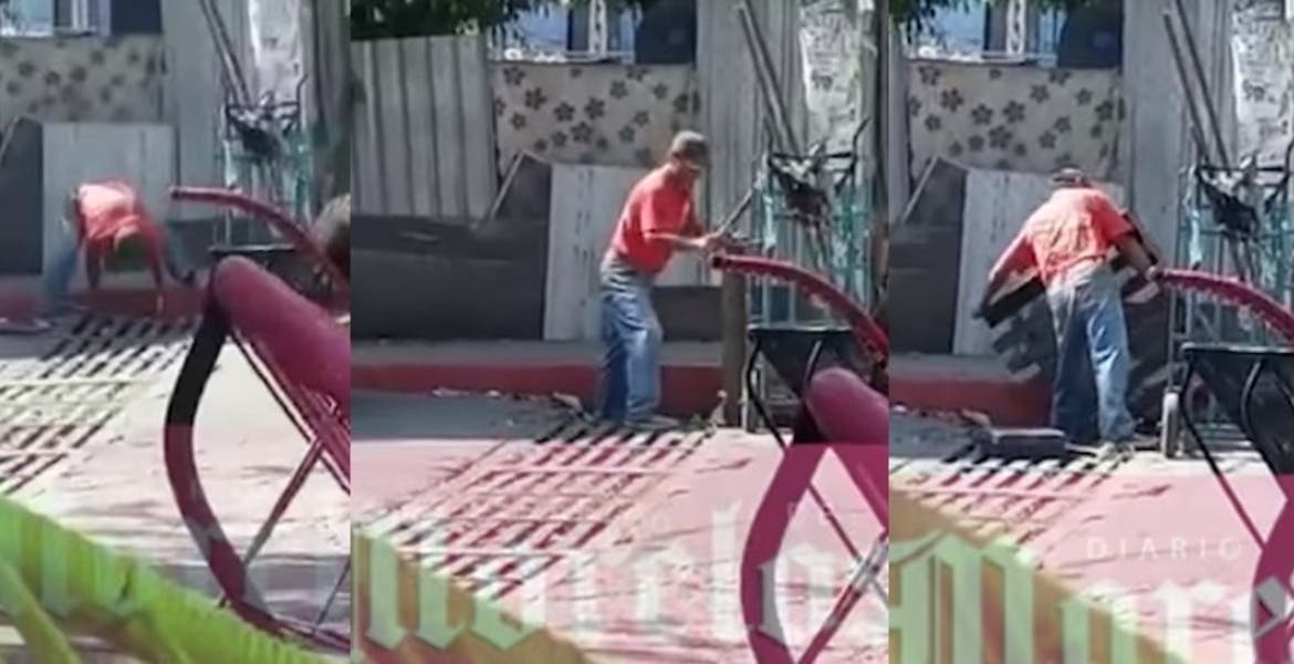 Ante la mirada de testigos que grabaron el video, el sujeto ni se inmuta y con una varilla desprende la alcantarilla.