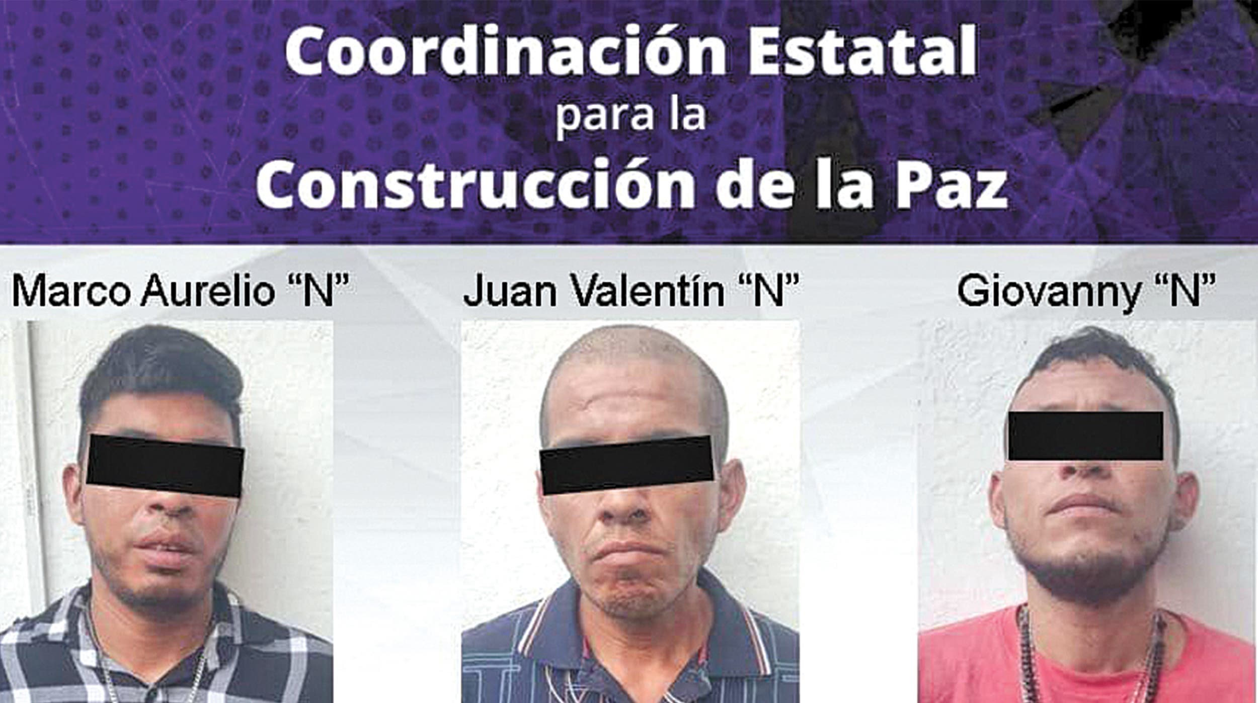 La Comisión Estatal de Seguridad (CES) informó que Marco Aurelio “N”, de 21 años; Juan Valentín “N”, de 32; y Giovanny “N”, de 25 años, son los detenidos.
