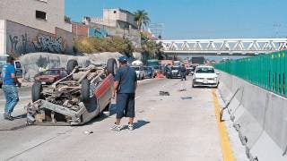 Un auto acabó volcado llantas arriba en el Paso Express, a la altura de la colonia Flores Magón, en Cuernavaca, luego de que su conductor perdiera el control y se impactara contra el muro de contención. Foto: STAFF / DDM