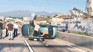 Dos personas resultaron heridas al volcar un Corsa azul, tras impactar a una camioneta de Protección Civil, luego de que disminuyera su velocidad por las obras de mantenimiento que realiza Capufe en los carriles centrales del Paso Express, a la altura de la colonia Antonio Barona, en Cuernavaca.
