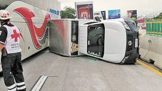 Cuernavaca, Morelos.- El exceso de velocidad y la falta de precaución al transitar sobre los carriles centrales del Paso Express, con dirección a Ciudad de México, provocó ayer una carambola en la que estuvieron involucrados cinco autos, entre ellos una camioneta que volcó. El percance ocurrió la mañana de ayer, cuando un coche Aveo blanco disminuyó su velocidad, sin embargo, los otros cuatro vehículos fueron impactándose entre ellos, siendo una camioneta Nissan blanca la que volcó al recibir el golpe por detrás, pero ninguna persona resultó lesionada.