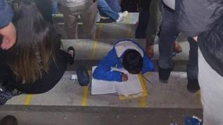 Niño se lleva la tarea al estadio, para no perderse el partido