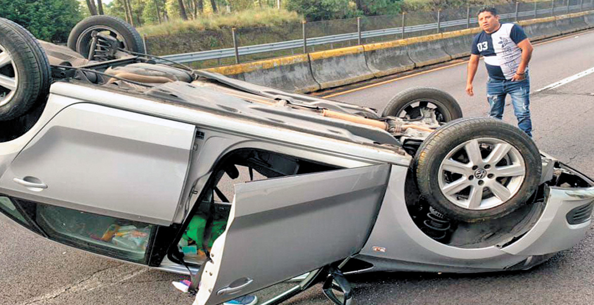Debido al exceso de velocidad, un automóvil Focus, color verde, chocó contra un Vento gris que quedó volcado en el kilómetro 47 de la Autopista México-Cuernavaca, a la altura del arco que divide Morelos y la Ciudad de México, la mañana de ayer.