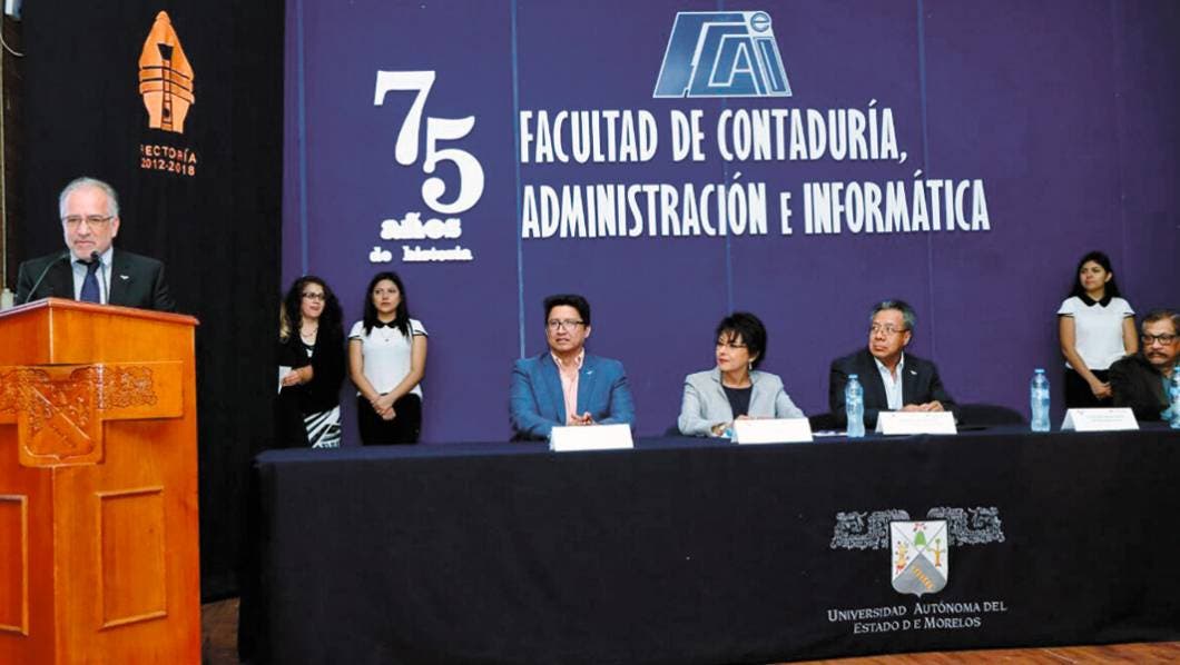 Cuernavaca, MORELOS.- Los 75 años de historia de la Facultad de Contaduría, Administración e Informática (FCAeI) de la Universidad Autónoma del Estado de Morelos (UAEM) fueron conmemorados, ayer durante la mañana, en el auditorio "Emiliano Zapata" del campus Chamilpa.