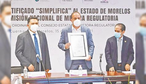 Cuernavaca, Morelos.- El Gobernador Cuauhtémoc Blanco Bravo recibió el certificado “Simplifica” que el Consejo Nacional de Mejora Regulatoria (Conamer) otorgó al estado de Morelos por implementar acciones de simplificación en trámites y servicios, lo que facilita la apertura de nuevas empresas y la generación de empleo.