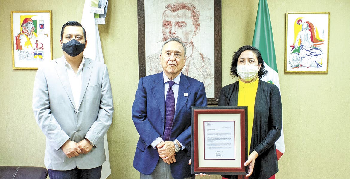 Ventura Valle entregó la constancia emitida por los CIEES a Jasania Moreno Estrada, directora académica, y Abraham Carrillo Gallardo, jefe académico del área de Ciencias Administrativas, a quienes felicitó.
