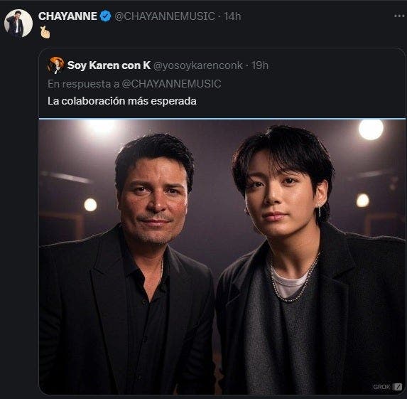 Chayanne, siempre cercano a sus seguidores, pidió en su cuenta de X (anteriormente Twitter) que le enviaran imágenes creadas con IA. Entre las fotos que recibió, dos mostraban al cantante junto al talentoso Jungkook. En la primera imagen, los dos aparecen cantando juntos, algo que emocionó enormemente a Chayanne. El cantante reaccionó a esta imagen con un tierno emoji de corazón realizado con la mano, que se ha vuelto uno de sus símbolos más populares.