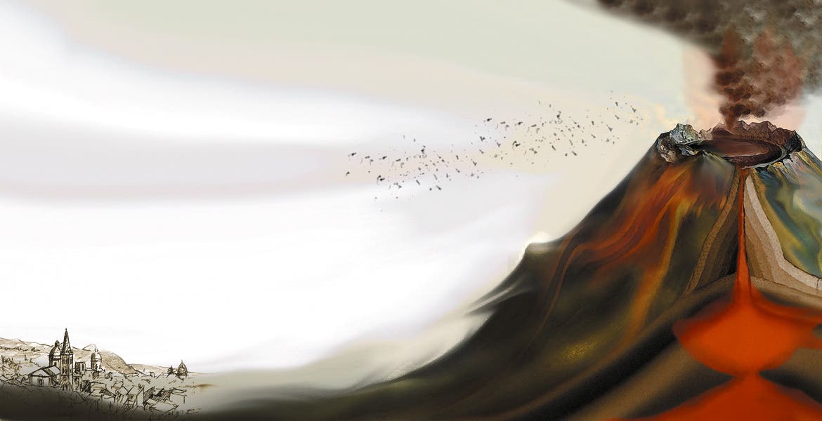 En lo profundo del volcán, el magma rico en gases llena por completo la cámara magmática. En la superficie se producen convulsiones telúricas que dilatan el volcán.