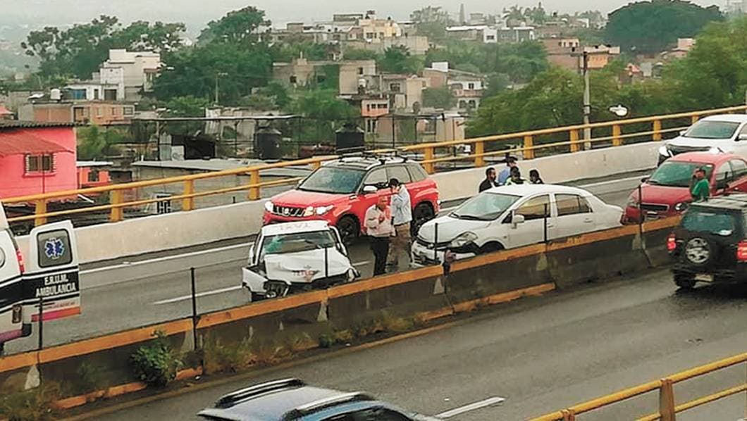 Al menos 12 vehículos participaron en distintos choques suscitados ayer en la mañana en el Paso Express, a la altura de la colonia Satélite y El Polvorín, en Cuernavaca, dejando como saldo dos personas heridas que fueron atendidas por paramédicos del ERUM y trasladadas al Hospital General “Dr. José G. Parres” de Cuernavaca.