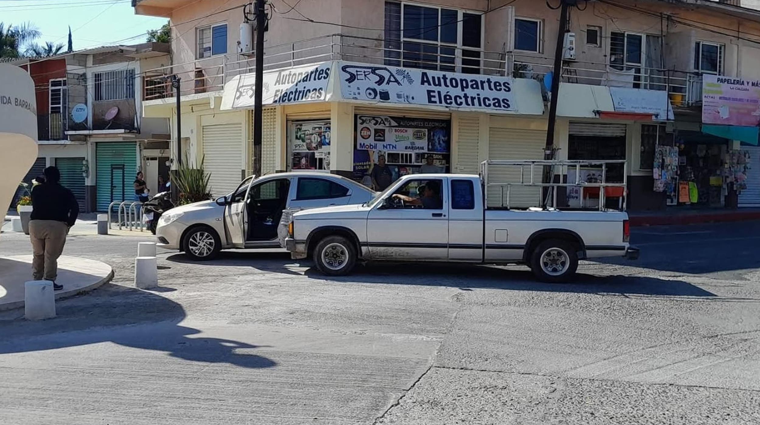 Cuautla.– Un aparatoso accidente ocurrió la mañana de este viernes en la colonia Emiliano Zapata, luego de que dos vehículos chocaran al incorporarse a la glorieta ubicada en la calzada Santa Inés, en la esquina con la calle Retirada de Calleja.