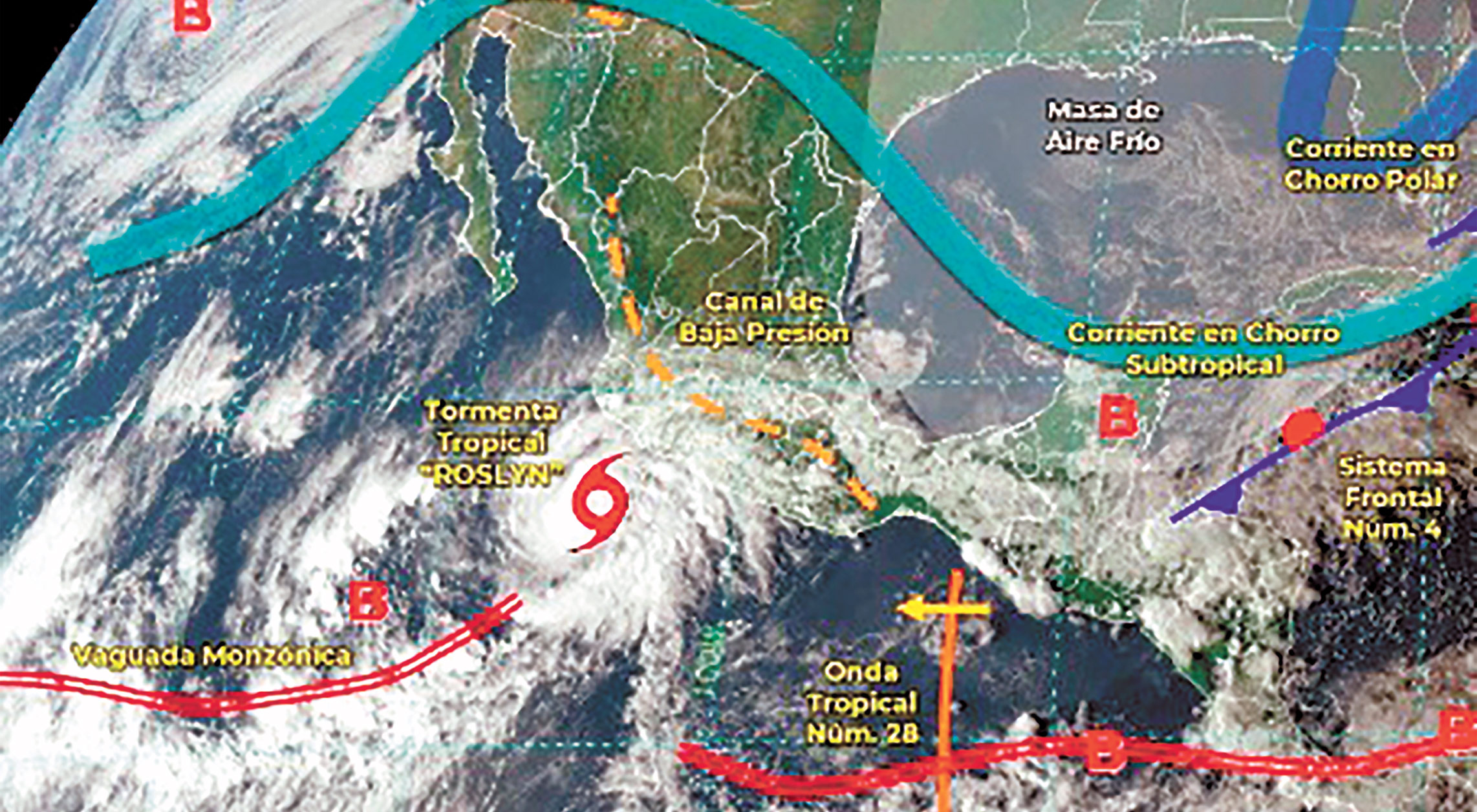 La presencia del ciclón tropical “Roslyn” en el Pacífico favorecerá ingreso de humedad y condiciones relativamente inestables en estados de la costa occidental y parte del centro del territorio nacional, mientras que, en la mayor parte del país, seguirá dominando tiempo más estable.