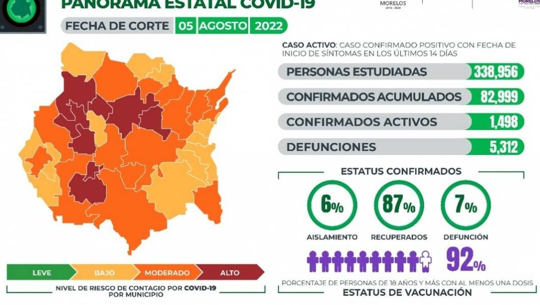 La Secretaría de Salud Morelos informa que a la fecha en Morelos se han estudiado 338 mil 956 personas, de las cuales se han confirmado 82 mil 999 con coronavirus COVID-19; mil 498 están activas y se han registrado 5 mil 312 defunciones.