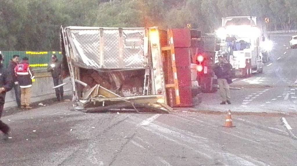 La autopista México-Cuernavaca con dirección hacia Morelos fue cerrada parcialmente debido a la volcadura de un tráiler que transportaba frutas y legumbres a la altura del kilómetro 24.