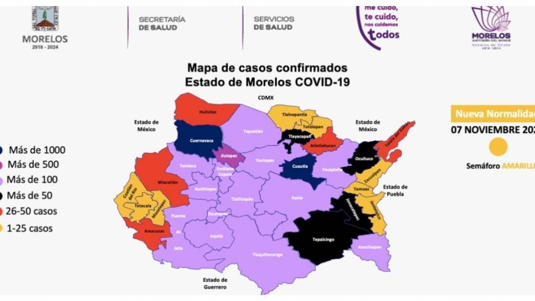 Precisó que los casos confirmados se encuentran distribuidos de la siguiente manera, Cuernavaca, mil 903; Cuautla, mil 038; Jiutepec, 718; Ayala, 309; Jojutla, 272; Temixco, 271; Yautepec, 254; Emiliano Zapata, 243; Zacatepec, 236; Xochitepec, 194; Yecapixtla, 150; Tlaltizapán, 148; Puente de Ixtla, 139; Axochiapan, 123; Tepoztlán, 106; Xoxocotla, 102; Tlaquiltenango, 101; Tlayacapan, 98; Tepalcingo, 80; Jonacatepec, 56; Ocuituco, 54; Huitzilac, 49; Atlatlahucan, 47; Amacuzac, 38; Tetela del Volcán, 34; Miacatlán, 31; Totolapan, 24; Jantetelco, 22; Temoac, 20;Tlalnepantla, 19;Mazatepec, 18; Coatlán del Río y Tetecala, 17; Zacualpan de Amilpas, 15; Coatetelco, 11; Hueyapan, 1; otros estados, 151.