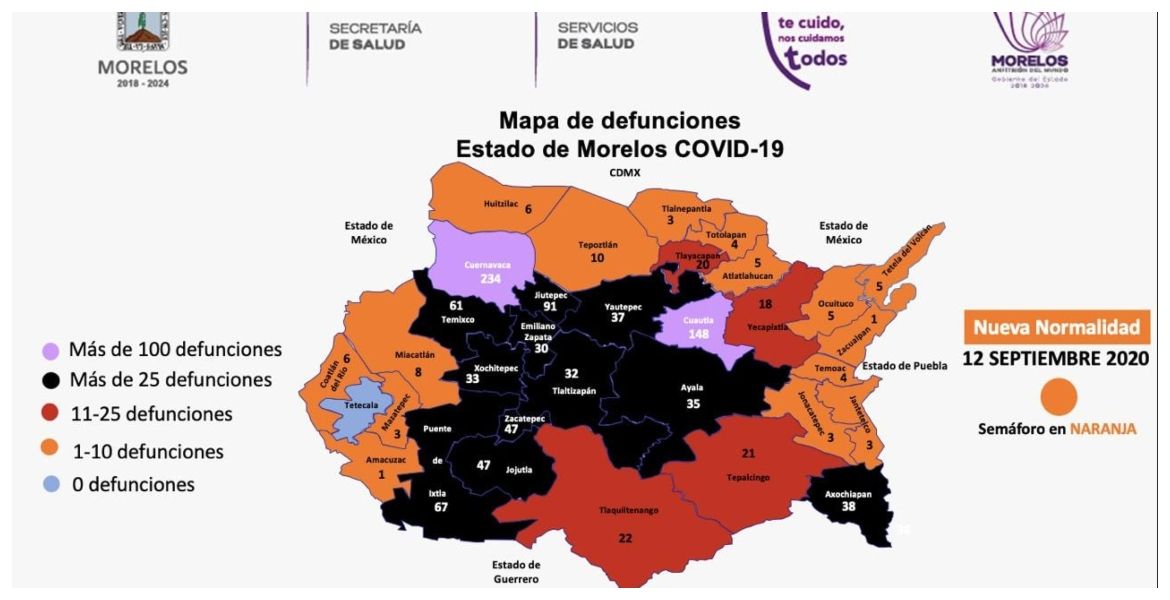 Precisó que los casos confirmados se encuentran distribuidos de la siguiente manera, Cuernavaca, mil 396; Cuautla, 868; Jiutepec, 558; Ayala, 273; Jojutla, 227; Temixco, 216; Yautepec, 191; Zacatepec, 190; Emiliano Zapata, 183; Xochitepec, 156; Tlaltizapán, 126; Puente de Ixtla, 119; Axochiapan y Yecapixtla, 118; Xoxocotla, 100; Tepoztlán y Tlaquiltenango, 83; Tlayacapan, 82; Tepalcingo, 68; Jonacatepec, 45; Ocuituco, 36; Atlatlahucan, 35; Huitzilac, 32; Tetela del Volcán, 28; Miacatlán, 24; Amacuzac, 23; Totolapan, 22; Tlalnepantla, 19; Coatlán del Río, Jantetelco y Mazatepec, 17; Tetecala y Temoac, 14; Zacualpan de Amilpas, 13; Coatetelco, 10; Hueyapan, 1; otros estados, 114.