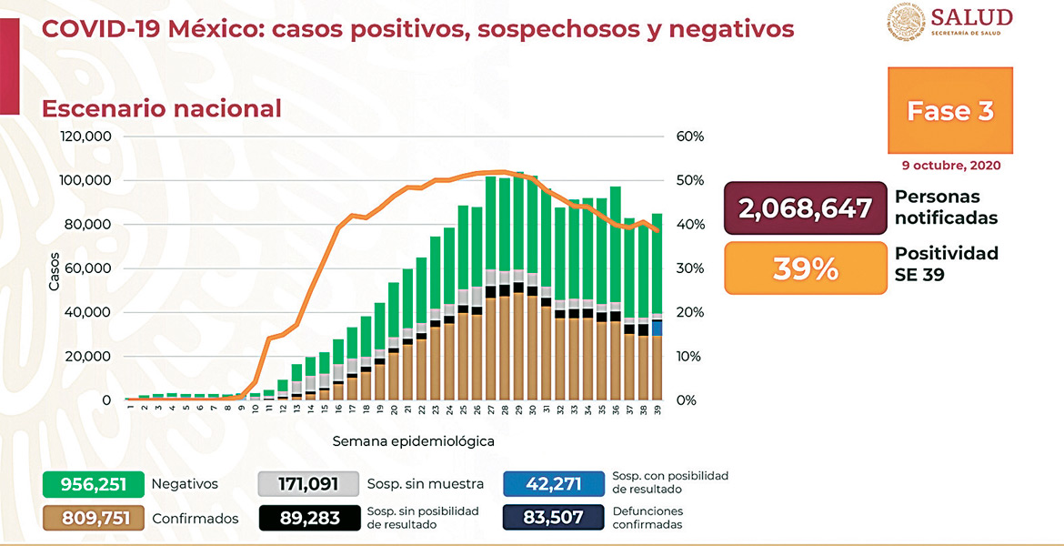 Hasta este viernes en México se registran 809 mil 751 casos confirmados de COVID-19, existen 956 mil 251 casos negativos y 83 mil 507 personas fallecidas.
