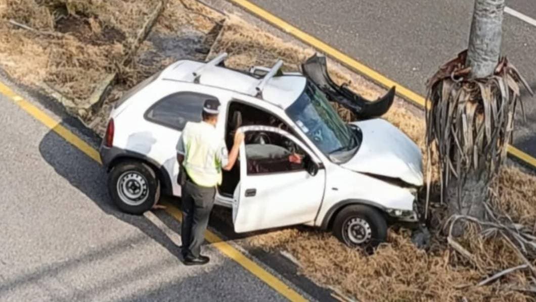Jojutla.- Hace unos minutos, el conductor de un vehículo Chevy blanco chocó contra un par de palmeras ubicadas sobre el kilómetro 132 de la Autopista del Sol, a la altura del poblado de Tequesquitengo.