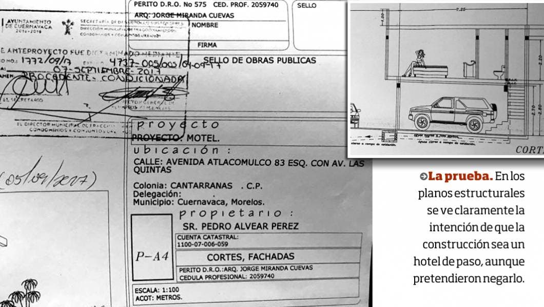 Los planos sometidos a autorización del Gobierno municipal indican textualmente "Motel", en avenida Atlacomulco 83 esquina con Las Quintas, para el cual se registra como perito D.R.O. al arquitecto Jorge Miranda Cuevas, junto a lo que se aprecia el sello del Ayuntamiento de Cuernavaca.