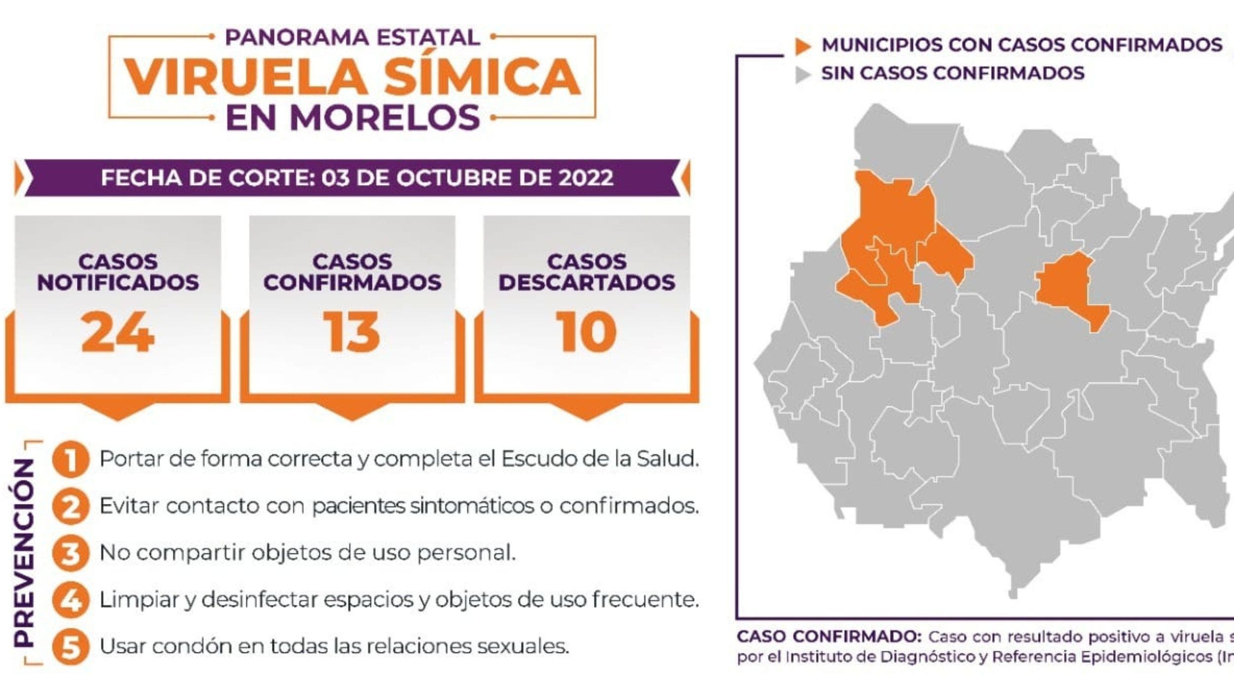 Al corte del lunes 03 de octubre de 2022, en Morelos se tienen un total de 24 casos, de este número, 13 confirmados acumulados a la enfermedad, 10 han sido descartados y 1 caso probable en espera de resultados por el InDRE.