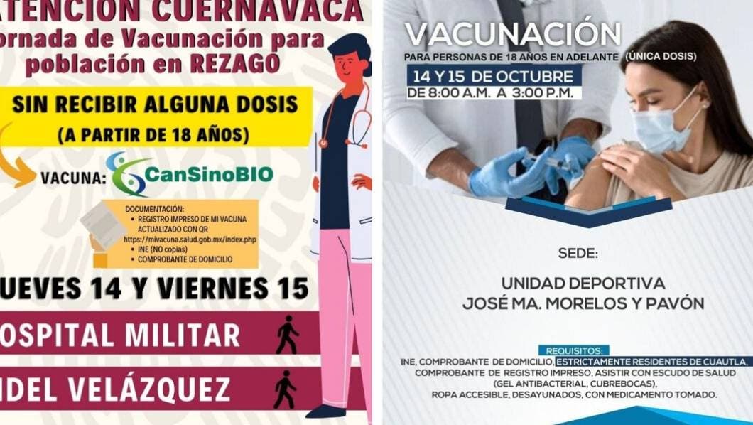 De acuerdo con la Estrategia Nacional de Vacunación contra COVID-19 en Morelos, la inmunización para personas rezagadas de cualquier municipio se realizará el jueves 14 y viernes 15 de octubre.