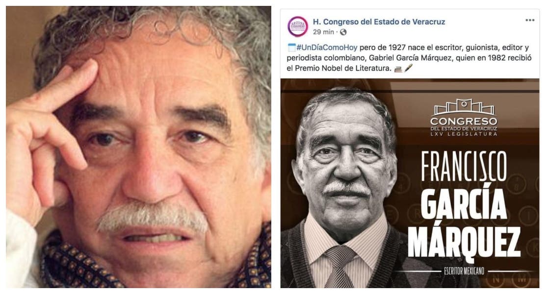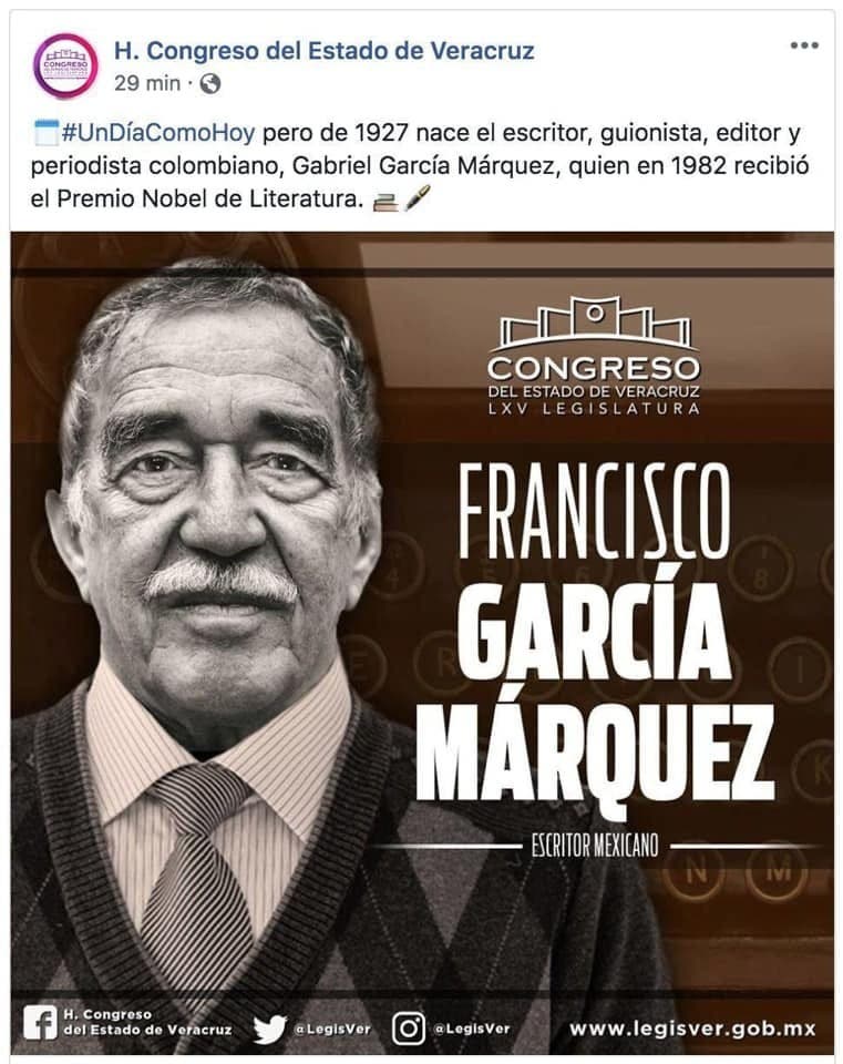 En sus redes sociales, el Congreso de dicha entidad intentó conmemorar el natalicio del premio Nobel de Literatura 1982, quien nació el 6 de marzo, pero le asignó el nombre de "Francisco" García Márquez y la nacionalidad mexicana.
