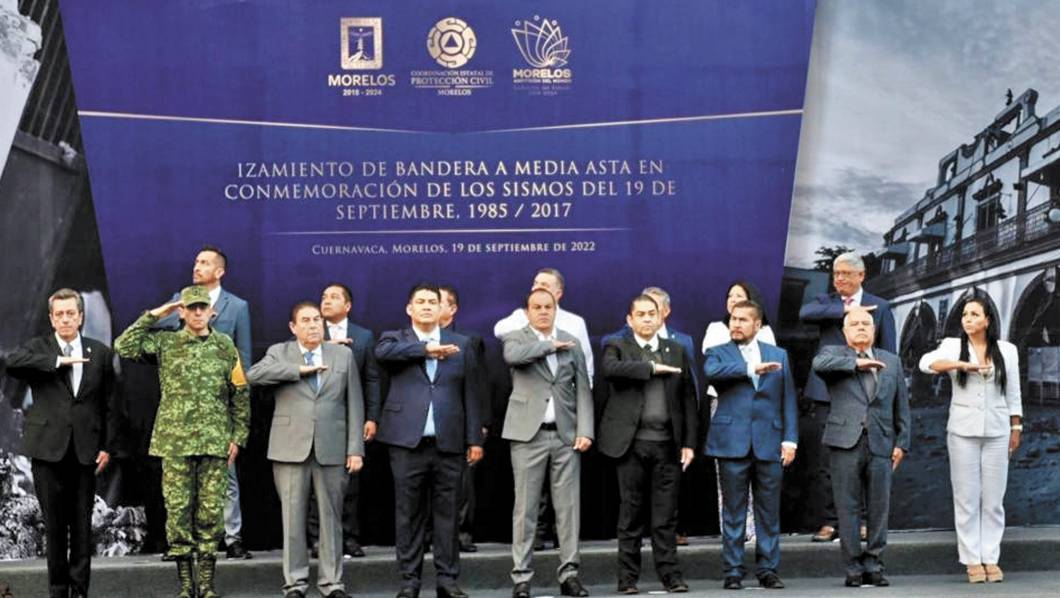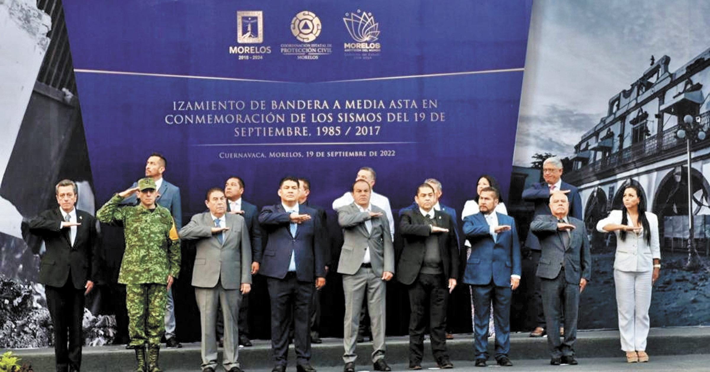 CUERNAVACA, MORELOS.- El Gobernador Cuauhtémoc Blanco Bravo encabezó el izamiento de bandera a media asta en conmemoración de los sismos del 19 de septiembre de 1985 y 2017.