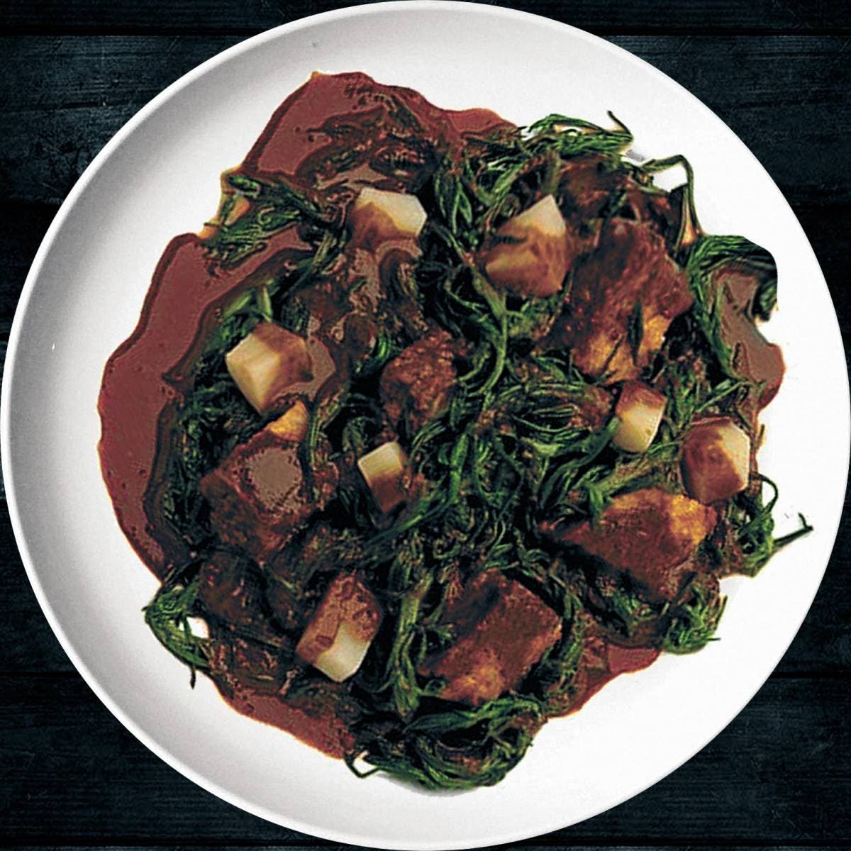 Remojar el bacalao 24 hrs antes y cambiar el agua 4-5 veces. En una cacerola se agrega aceite y ajo, se agrega el pescado y se fríe después se desmenuza se agrega puré, después se incorpora el bacalao y se le agregan las papas, aceitunas, alcaparras y pimiento morrón. El chile pasilla se licúa y se pone a freír, después se incorpora al bacalao y se deja cocinar.