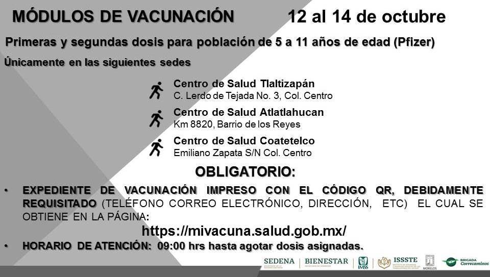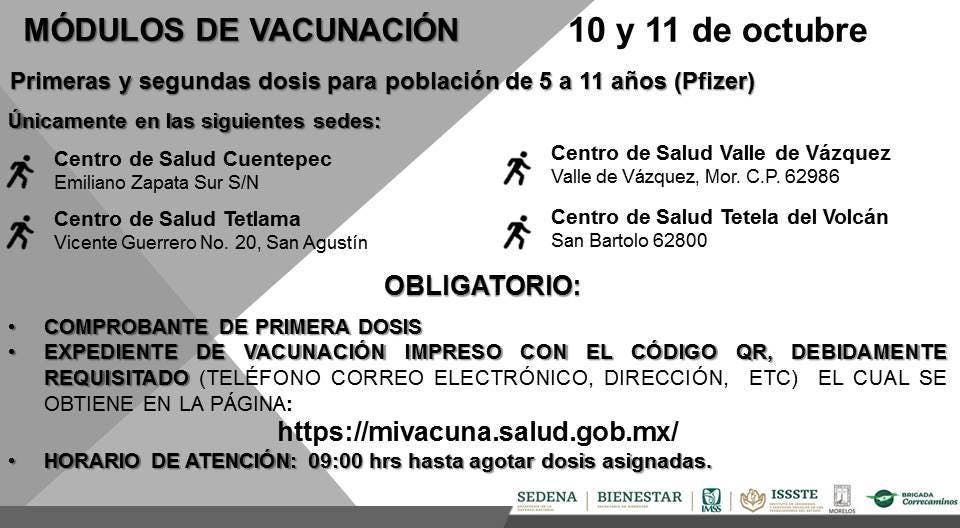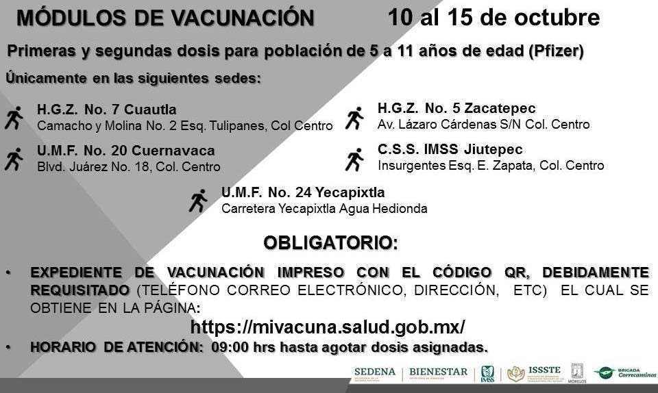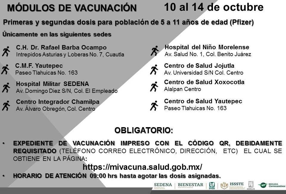 La Brigada Correcaminos en Morelos informa que a partir del 10 de octubre mantendrá la aplicación de primeras y segundas dosis de Pfizer contra COVID-19 en niñas y niños de 5 a 11 años de edad en diferentes municipios de la entidad.