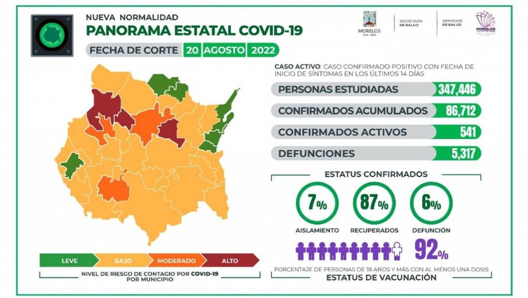 La Secretaría de Salud informa que a la fecha en Morelos se han estudiado 347 mil 446 personas, de las cuales se han confirmado 86 mil 712 con coronavirus COVID-19; 541 están activas y se han registrado 5 mil 317 defunciones.