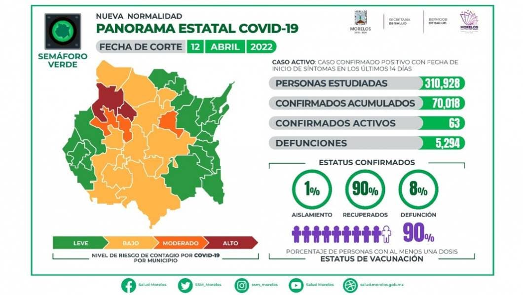 La Secretaría de Salud informa que a la fecha en Morelos se han estudiado 310 mil 928 personas, de las cuales se han confirmado 70 mil 018 con coronavirus COVID-19; 63 están activas y se han registrado 5 mil 294 defunciones.