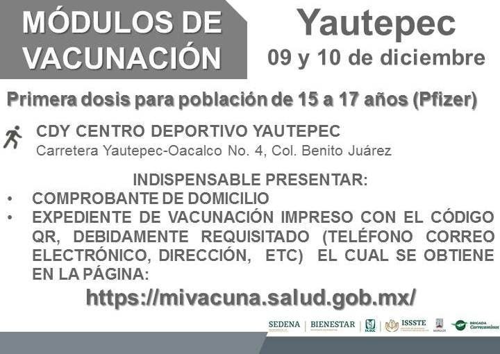 En Yautepec, la aplicación de primeras dosis de Pfizer para adolescentes de 15 a 17 años se realizará el jueves 9 y viernes 10 de diciembre a partir de las 10:00 horas y hasta agotar las dosis asignadas en:
