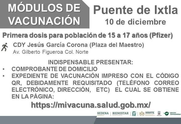En Puente de Ixtla, la vacunación de primeras dosis de Pfizer para adolescentes de 15 a 17 años se realizará el viernes 10 de diciembre a partir de las 10:00 horas y hasta agotar las dosis asignadas en el siguiente punto: