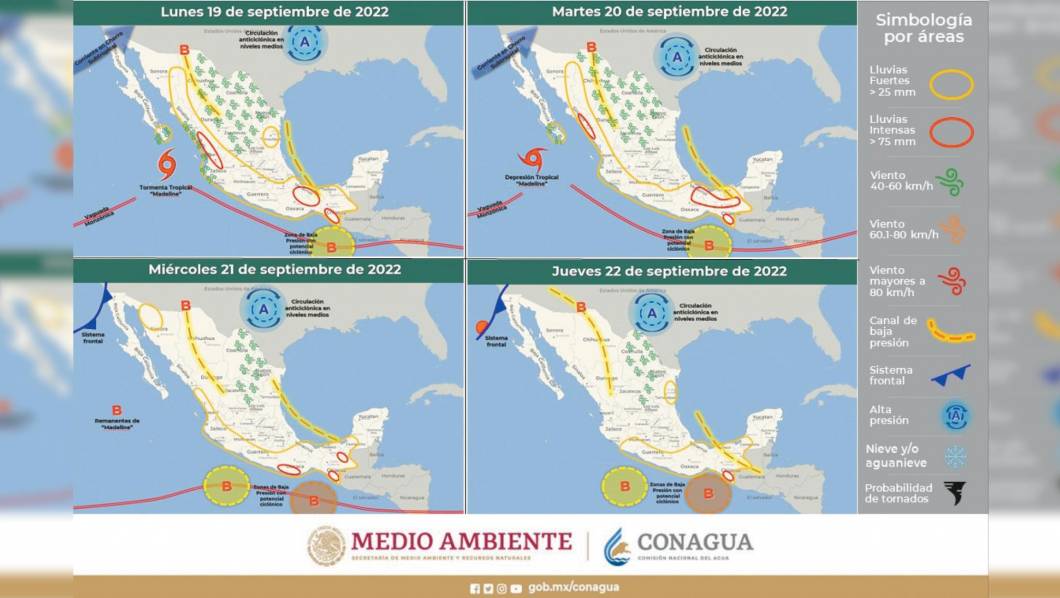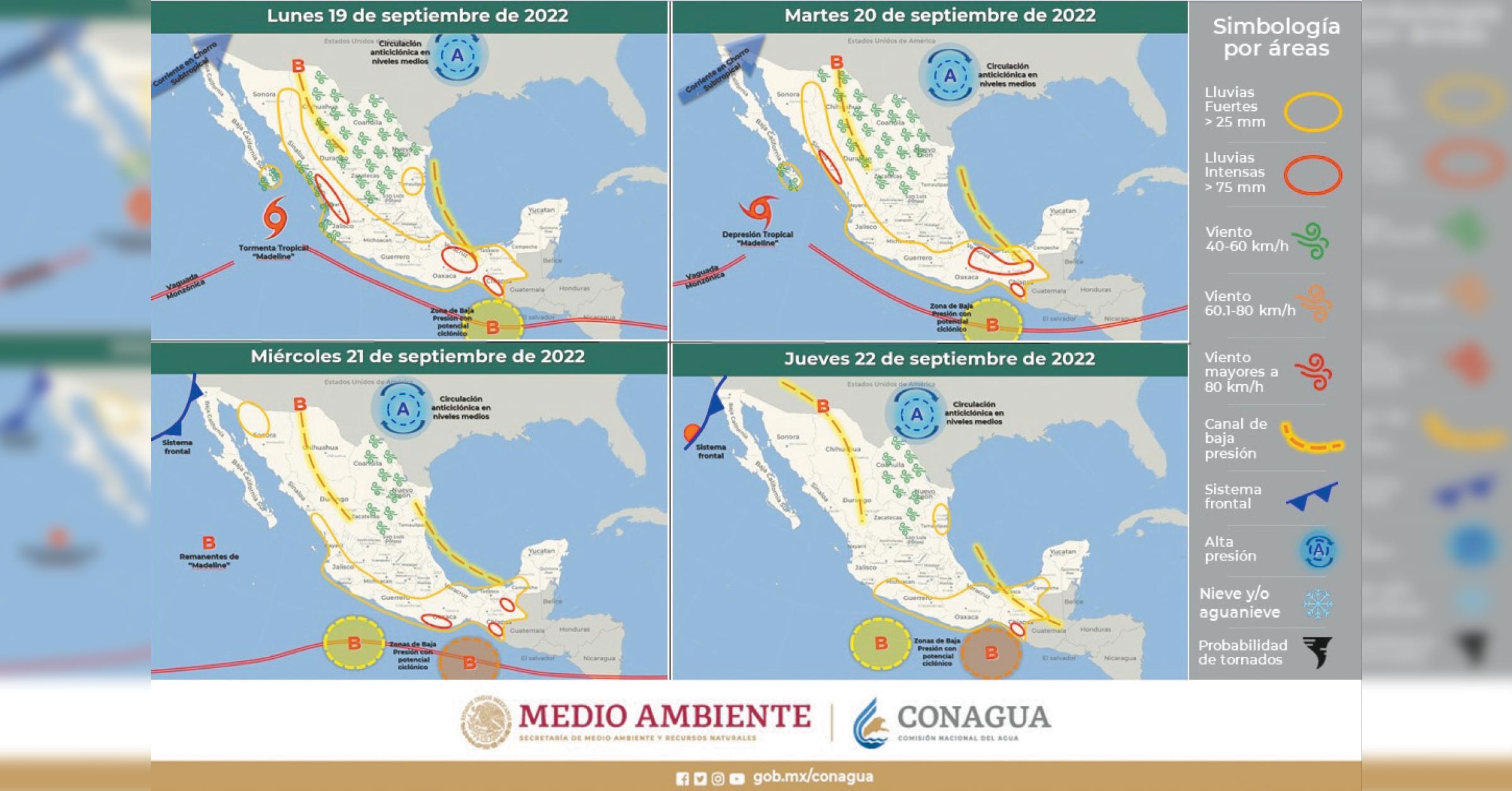 El ciclón tropical “Madeline” continuará desplazándose frente a la costa occidental del territorio nacional, lo que, sumado a canales de baja presión en el Golfo de México e interior del país, mantendrá inestabilidad y desarrollo de tormentas y lluvias en diversos estados del territorio nacional.
