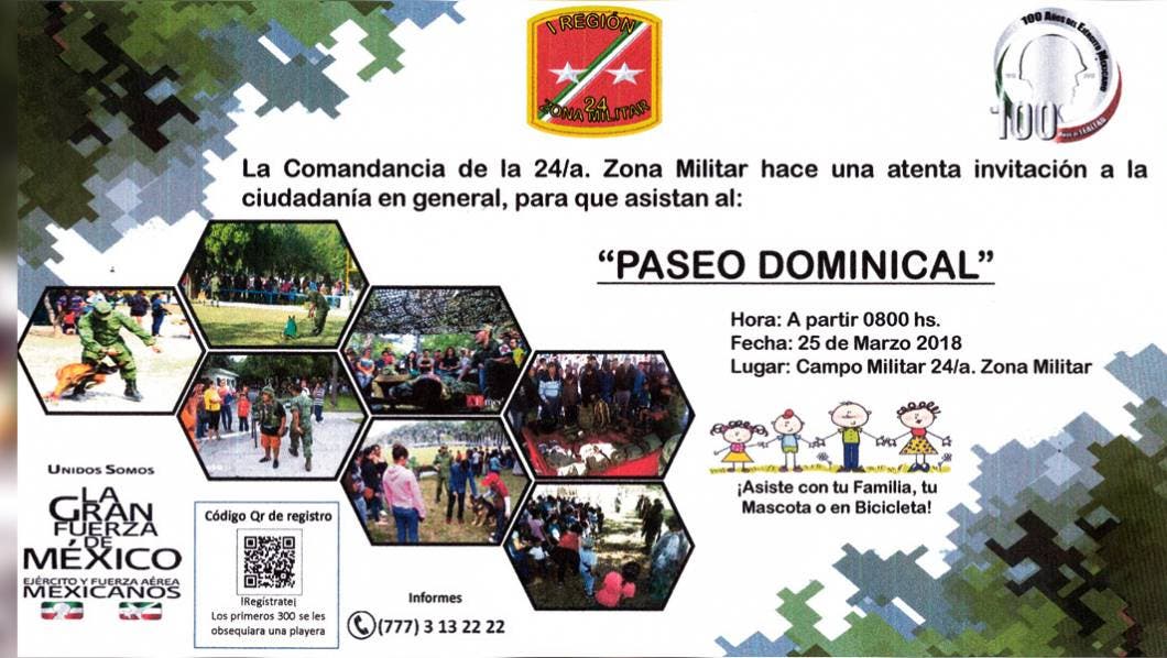 CUERNAVACA, MORELOS.- La Secretaría de la Defensa Nacional (Sedena) a través de las comandancias de la I Región Militar y de la 24a Zona Militar, invitan a la población a que asistan en familia al "Paseo Dominical", que se realizará en las instalaciones del 3er Regimiento Blindado de Reconocimiento, de Av Emiliano Zapata 1002, de 8:00 a 12:00 horas, el día 25 de marzo.
