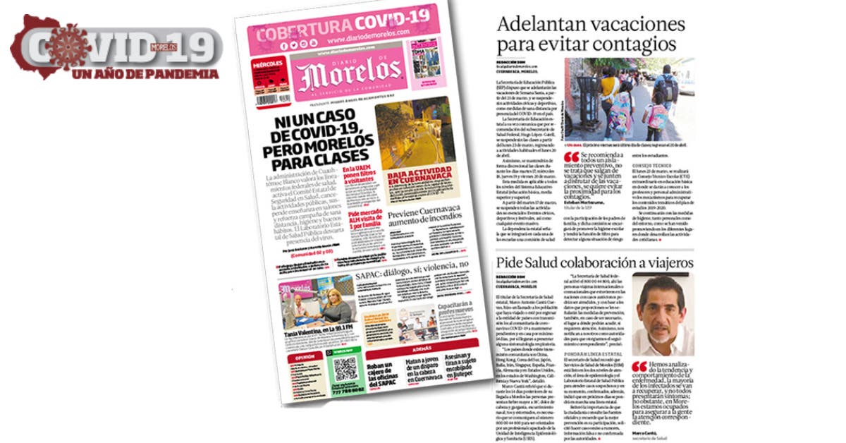 A pesar de que Morelos no registraba ningún caso confirmado, la Secretaría de Salud del Estado, anunció la suspensión de clases en todos los niveles educativos y se reanudarían el 23 de abril.