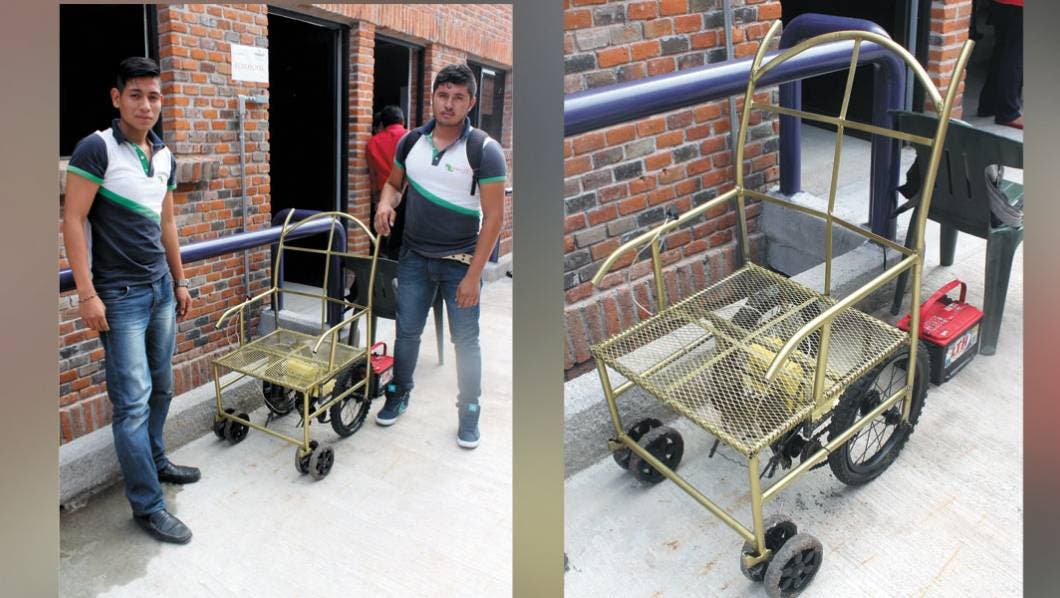 CUERNAVACA, MORELOS.- José Armando Arizmendi y Luis Gustavo Álvarez, del equipo mantenimiento de máquinas e instalaciones eléctricas del CECyTE plantel 03, Emiliano Zapata, han comenzado un gran proyecto, una silla de ruedas eléctrica.