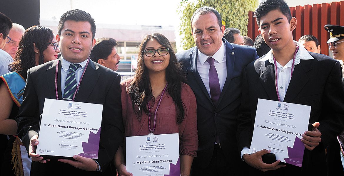 En este marco, el jefe del Ejecutivo también entregó la ‘Medalla Benito Juárez García’ a estudiantes ganadores que participaron en la elaboración de un ensayo en el que abordaron la vida y obra de Benito Juárez.
