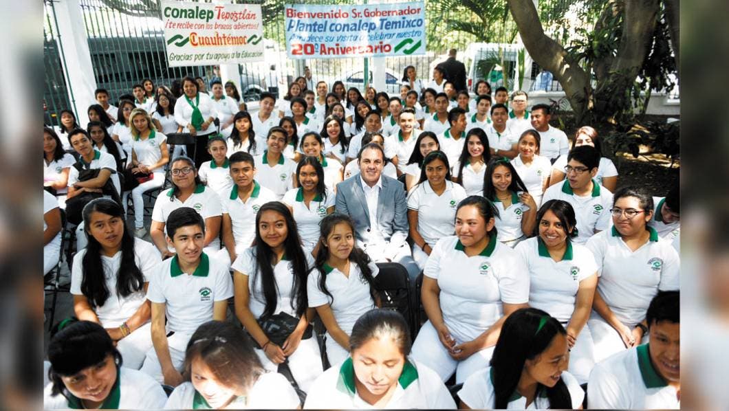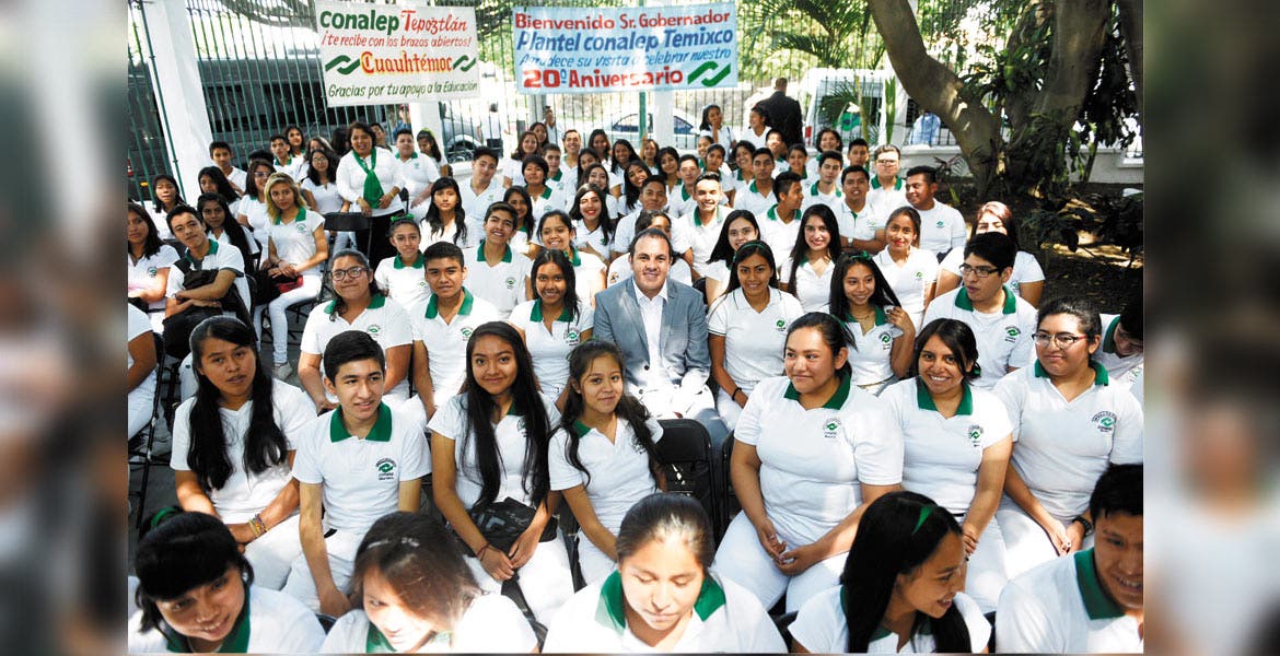 Respaldo. Alumnos y maestros del Conalep compartieron con el Gobernador Cuauhtémoc Blanco el 20 aniversario del subsistema, a quien dieron su respaldo con porras y aplausos.