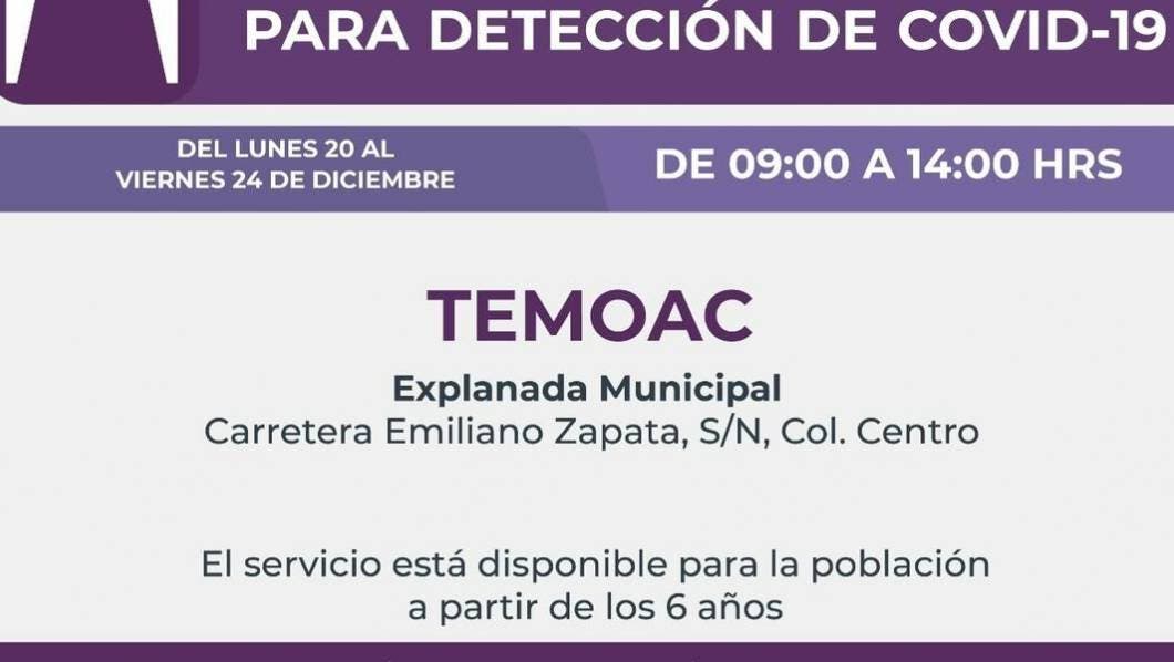 Del 20 al 24 de diciembre, el Gobierno estatal, a través de la Secretaría de Salud y Servicios de Salud de Morelos (SSM), ubicará el módulo de pruebas antigénicas en la explanada municipal de Temoac.