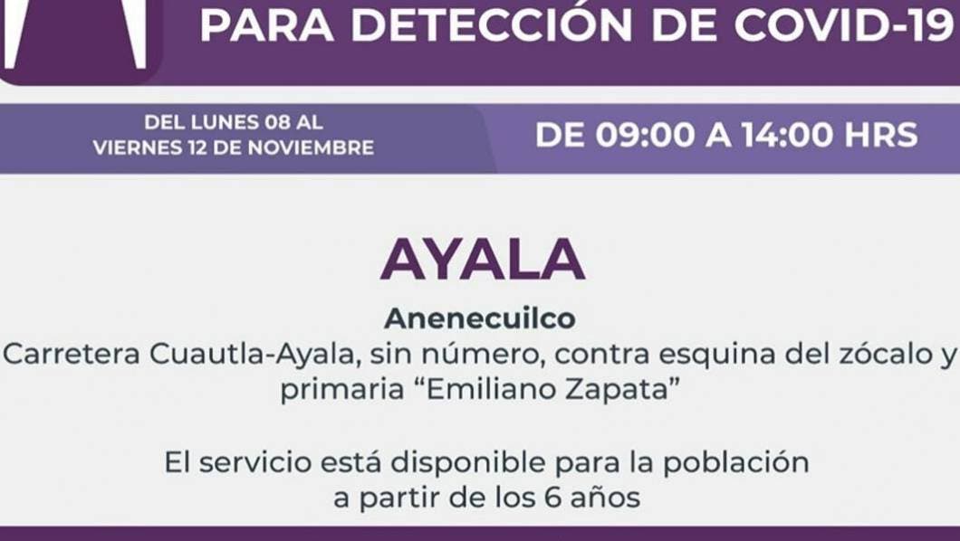 La Secretaría de Salud a través de Servicios de Salud de Morelos (SSM) informó que el módulo de pruebas antigénicas para la población en general y menores de cero a cinco años, estará disponible en carretera Cuautla-Ayala, sin número, contra esquina del zócalo y la primaria “Emiliano Zapata”, en la comunidad de Anenecuilco, del municipio de Ayala.