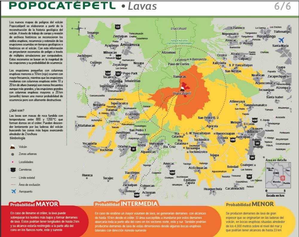 Según el Atlas Nacional de Riesgos del Cenapred, los flujos de lava pueden alcanzar distancias de hasta 2 km en condiciones normales, extendiéndose hasta 10 km en caso de mayor volumen de lava, y hasta 23 km en escenarios de erupciones laterales, dependiendo de la dirección (noreste-suroeste). Morelos, ubicado dentro de un radio de 65 km del volcán, junto con otros estados como Ciudad de México (30 km), Puebla (50 km) y Tlaxcala (60 km), alberga a 23 millones de personas en un radio de 100 km, lo que lo convierte en una zona de alto interés para la mitigación de riesgos. El atlas se puede consultar en: