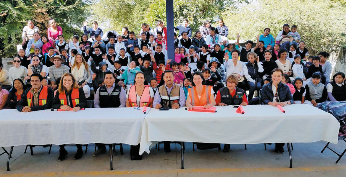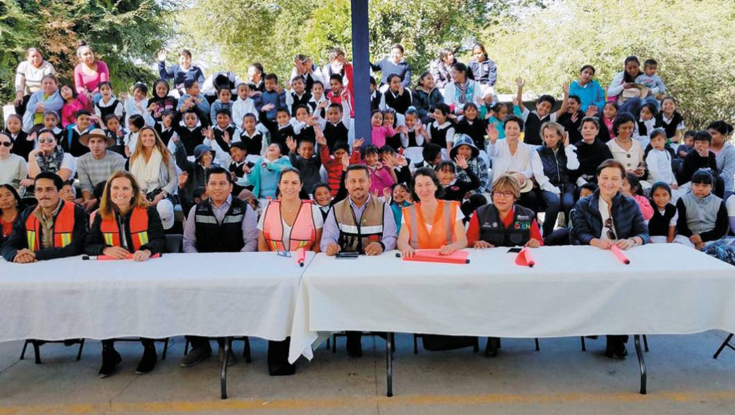 Inicio. La secretaria de Educación, Beatriz Ramírez Velásquez, acompañada por los integrantes de las fundaciones que financiarán la reconstrucción del plantel "General Emiliano Zapata", de La Nopalera.